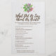 Este lujoso juego rústico floral suculento de bingo nupcial es perfecto para una ducha de novias con temática desértica. La parte delantera de la tarjeta de juego incluye "bingo de novia", y la parte trasera de la tarjeta muestra "¿qué dijo el novio?" con preguntas de personalizable. El diseño se caracteriza por unos magníficos suculentos verdes, rosados y violetas coloridos, dispuestos sobre una corona de ramas y acentuados con confetti de oro falso. Personalice la parte delantera de la tarjeta con el nombre de la novia y la fecha de la ducha.