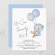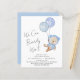 Las parejas de niños de Boho, amigable con el presupuesto, duchan una invitación que incluye un lindo ilustracion acuarela de un oso de peluche azul flotando con globos, y "Podemos esperar temprano" en un guión caligráfico escrito a mano. Añada los nombres de los futuros padres y los detalles de la ducha en una tipografía simple.