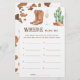 Este diseño presenta colores neutros modernos en una aplicación acuarela. Diseño en estampado de vacas, vaso de champán, cactus del desierto, botas de vaquero.