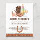 Boots y burbujeante invitación al presupuesto de la ducha de novias del país de cowgirl occidental. Botas de vaca, champán, copas de champán, un anillo, herradura para una ducha de novias rústica rústica de campo occidental, invitaciones asequibles.