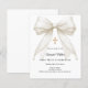 White background, decorated with a large ivory colored bow with pearls and a golden cross. Personalize and add a name and details details.