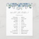 Tarjeta de juego con ducha de novia con cascada de flores azules. Una forma divertida de interactuar con los duchas.