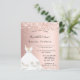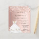 Una invitación moderna, elegante y glamurosa para una ducha de novias. Oro rosa, fondo degradado de color negro con purpurina falso, chispas y vestido blanco. El nombre está escrito con una escritura de estilo con letras a mano moderna. Personalice y agregue los detalles de su fiesta.