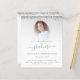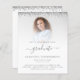 A value for money BUDGET alternative on a smaller size 4.5 x 5.6” semi-gloss 110lbs weight, which is of similar thickness to a postcard (however is not suitable to use as a postcard.). PLEASE NOTE there is ONE per sheet. Budget 2023 Graduation Photo Silver Glitter Party Invitation. Glam silver faux glitter borders are at the top on the both sides. Graduate is in an elegant script with swashes. Easily personalise the text to your own requirements, and replace the sample image with your own. To keep the minimalist contemporary look of this design, a photo with a light colored background will work well.