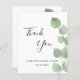Una tarjeta de agradecimiento para una ducha de novia. Un fondo blanco de moda decorado con vegetación eucalipto. En el frente, gran guión con letras de color negro y el texto: Gracias, tu y una fecha. Atrás: Personaliza y agrega tu nota de agradecimiento y nombre.