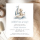 This cute baby shower invitation features a dusty blue and beige watercolor illustration of a teddy bear riding in a sailboat. The words "AHOY! It's a Boy!" and the name of the mom-to-be appear in dusty blue decorative font. Ideal for a nautical-themed boy's baby shower.