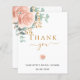 Una moderna y elegante tarjeta de agradecimiento para despedida de soltera. Un fondo blanco chic. Decorado con rosas rosadas y doradas, flores y hojas de eucalipto pintadas con acuarela, ramitas, follaje y ramitas doradas falsas. Letras negras y doradas. En la parte frontal el texto: Gracias, nombre y fecha.