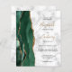 The left-hand edge of this elegant modern wedding invitation features an emerald green watercolor agate border trimmed with faux gold glitter. The customizable text combines gold-colored handwriting script with black copperplate and italic fonts on a gray and white marble background. The reverse side provides spaces for 4 photos (1 square, 2 horizontal, 1 long vertical) and room for your wedding website URL or other information.