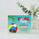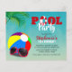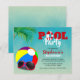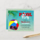 Throwing a pool party for your little one on a budget. Then these fun colorful pool birthday party invitations are ideal. Featuring a ombre blue water background, palm tree leaves, beach ball, sunglass and a modern birthday party template that is easy to customize.