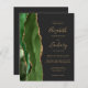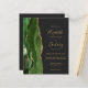 The left-hand edge of this elegant modern wedding invitation features a hunter green watercolor agate border trimmed with faux gold glitter. The customizable text combines gold-colored handwriting, copperplate and italic fonts on a dark off-black background. The reverse side provides spaces for 4 photos (1 square, 2 horizontal, 1 long vertical) and room for your wedding website URL or other information.