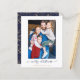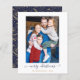 BUDGET Navy Blue Gold Simple Script Modern Merry Christmas Photo Card con tus fotos favoritas y un guión sencillo pero elegante Feliz Navidad. La parte trasera está decorada con un estampado festivo y elegante de hojas de Relieve metalizado dorado, pino y otras plantas botánicas de invierno sobre un fondo azul marino de invierno. ¡Perfecto para tus tarjetas de vacaciones este año! **Nuestro artículo de PRESUPUESTO es más pequeño, más ligero y más delicado, pero aún hermoso! No olvide los sobres!** Si necesita ayuda o elementos coincidentes, por favor contáctenos a cedarandstring@gmail.com.