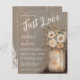 Budget Nothing Fancy Just Love Mason Jar Wedding Invitation. Embrace a farmhouse aesthetic with this delightful wedding invitation. A beautifully illustrated mason jar overflowing with soft, neutral-toned flowers sits atop a weathered wood background. The heartwarming phrase nothing fancy 'Just Love' is elegantly scripted. This invitation is ideal for couples seeking a simple yet sophisticated announcement for their wedding, promising a celebration filled with genuine affection and rustic charm. This rustic invitation is perfect for a country or barn wedding. The weathered wood background adds a touch of rustic elegance, making this invitation a beautiful way to announce your special day.