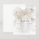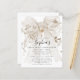 White watercolor coquette bow is decorated with roses and sage green greenery. A gold cross is placed above the text. Your daughter's name is written in a beautiful calligraphy script. All text is editable.