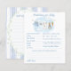 The Predictions for Baby and Baby Well Wishes game features a sweet watercolor clothesline strung across the top, proudly displaying tiny, adorable items, each featuring a cute bunny dressed in blue, with baby prediction questions and a space with advice for the parents to be. The back includes a space for Well Wishes for Baby with a custom hand-painted frame of a crisp blue vertical stripe pattern accented with a lush greenery wreath with a darling blue bow holding a bunch of fresh carrots all rendered in a soft watercolor style. Choose this fun activity which then becomes a special keepsake, every detail is crafted to be saved, tucked away in a baby book, and treasured for you and baby to remember the love of family and friends as he grows.