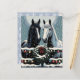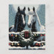 Papel craft navideño bonito para scrapbooking con gráficos de un caballo blanco y un caballo negro parados en una puerta de madera decorada con coronas navideñas y luces de Navidad brillantes y bonitas cubiertas de nieve. Estos caballos están hechos en un estilo pop art de cómic de dibujos animados para invocar una sensación nostálgica.