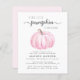 Una encantadora invitación a la ducha de bebé de una chica de bajo presupuesto con "A Sweet Little Pumpkin is On Her Way" en tipografía gris y un guión elegante, y una acuarela de calabaza rosa. Personalice el nombre de la madre y los detalles de la ducha en una tipografía simple.