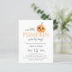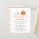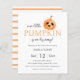 Sencilla y moderna invitación a usar papel para bebés en la ducha de Halloween con una calabaza linda sobre un fondo blanco limpio. Con las palabras "nuestra calabaza está en camino" y rayas naranjas pastel y blanco reverso. Listo para una fácil personalización.