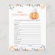 "Hay una calabaza en camino. ¡Celebren con la temática de la calabaza de este personalizado para el fiesta de la ducha de bebé! Acuarela linda calabaza kawaii personalizado con gorra de otoño (gorra) y hojas de otoño. En el reverso de la tarjeta están las hojas de otoño. RESPUESTAS: REVUELTAS, LLORACIÓN, PACIFICADOR, BOTELLA, LUZ NOCTURNA, LULLABY, ESPÍRITU, EPIDURAL, BURP, SILLA ALTA, BOLSA DE DIAPER, ESPADA