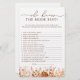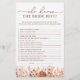 Este artículo es una fascinante mezcla de calidez otoñal y elegancia bohemia que promete hacer su celebración inolvidable. La pieza central de esta pieza es una calabaza muy bien hecha, delicadamente pintada en tonos suaves, que simboliza la abundancia y alegría de la temporada de otoño. Alrededor de la calabaza se encuentra una impresionante variedad de flores acuáticas y follaje en ricos tonos de terracota, naranja, que evocan los colores vibrantes del otoño. Este objeto captura con gusto el espíritu de una ducha de novia en otoño, combinando el encanto rústico con la elegancia bohemia para crear un diseño intemporal y encantador. Con su impresionante combinación de acuarela y elementos de moda boho, este artículo promete una celebración tan única y especial como la propia novia. Haga clic en el botón "Personalizar" para obtener más información sobre esta plantilla. Podrá modificar el estilo, los colores y los tamaños. Elementos coincidentes disponibles.
