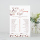 Añade un toque de diversión y risas a tu celebración con este encantador juego de ducha de bebé "¿Quién conoce mejor a mamá?". Con un diseño delicioso con calabazas acuáticas y elegantes flores de otoño en ricos tonos burdeos y rojos, complementa perfectamente su rústica ducha de bebé con tema de otoño. A los huéspedes les encantará adivinar las preferencias de las futuras mamás con estas interesantes preguntas de "esto o aquello", creando momentos memorables y una gran cantidad de entretenimiento.