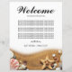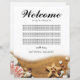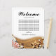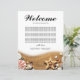 El destino de la playa recibe una carta boda con un fondo blanco simple, una playa de arena con una estrella de mar y conchas.