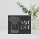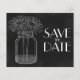 Boda de estilo rústico bonito Guardar la plantilla de volante de Invitación de fecha con un fondo de pizarra en gris carbón y negro. A la izquierda de la tarjeta hay un dibujo de una jarra de albañil llena de agua y dos simples flores de margarita. Se ajustará a un sobre A6 estándar de EE.UU. (no suministrado).