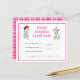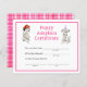 Carta de certificado de adopción de cumpleaños para el chica de bomberos con ilustracion de perros dálmatas con casco de bombero y gorra fiesta rosa. ¡Entregar animales rellenos durante el fiesta como un favor del partido junto con este certificado!