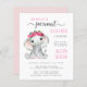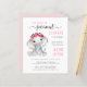 Una linda invitación a un chica amigable con el presupuesto, bebé, roció con "Our Sweet Little Peanut is On Her Way" (Nuestro dulce maní está en camino) escrito en una mezcla de tipografía rosa y gris suave y un guión de bonito con toallitas, y una acuarela de una niña elefante con una corona floral en la cabeza. Personalice los nombres del bebé Irl y la madre en tipografía rosa y los detalles de rociado en una simple tipografía gris moderna.