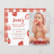 Ven y únete a nosotros para divertirnos un poco, nuestra dulce y pequeña berry se está volviendo una! Berry, primer cumpleaños, tema fiesta de un año. La parte delantera de esta tarjeta presupuestaria está dividida en dos secciones, a la izquierda, está el diseño de la invitación, y a la derecha, hay una foto del chica de cumpleaños. Hemos elegido una foto de plantilla de un niño comiendo un plato grande de fresas para coincidir con el tema de la carta. El diseño de la invitación incluye seis fresas acuáticas alrededor del borde, el nombre del chica de cumpleaños con letras de gran calibre a mano, y el "cumpleaños de la berry" en las capitales de los serif de estilo vintage. Hay un pequeño corazón de oro falso entre las dos secciones del texto. La parte trasera de las invitaciones es un patrón de cuadros pintado a mano. El estilo retro y las yeguas rojas se inspiran en los tarros de mermelada de fresa. Perfecto para celebraciones de primavera y verano, y temas al aire libre y de jardín. Invitaciones de primer cumpleaños de Berry dulce. Haga clic en "Personalizar esta plantilla" para editar el texto y cargar su propia foto. Para ediciones más avanzadas utilice la Herramienta de diseño de Zazzle. Como parte de la selección presupuestaria de Zazzle, esta hoja no es un tamaño de invitación estándar ni una calidad de papel. Si quieres este diseño en una tarjeta de invitación, puedes encontrarlo en nuestra tienda o usar la Máquina Zazzle Make para transferirlo al producto de tu elección. Tenga en cuenta que las tarjetas se imprimen cuando las vea en su pantalla al hacer el pedido, por lo que asegúrese de comprobar dos veces si hay errores tipográficos. Navega por mi tienda en busca de más invitaciones para la fiesta de cumpleaños de los chicas.