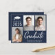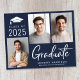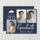 Moderna invitación de graduación de clase 2025, con presupuesto ajustado al azul oscuro, con 3 fotos y "Graduado" en un audaz guión blanco contemporáneo. Añada el nombre del graduado y la escuela o universidad en una simple tipografía blanca.