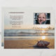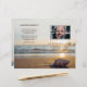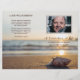 Programa funerario con temática de playa que incluye una foto de un conchón en una playa al amanecer. Añade una foto de tu ser querido junto con su nombre y años de vida. En la parte posterior puede escribir el obituario y el programa. ¡Pórtalo tú mismo para un programa práctico!