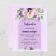 Un fondo violeta y lavanda acuático. Decorada con flores de color violeta y violeta y una cruz dorada. Personaliza y añade tu nombre y detalles de recepción. 1 hoja = 1 borde impreso de invitación al borde.
