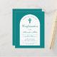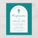 Una invitación moderna de confirmación para un niño. Sobre fondo azul turquesa, tiene un arco blanco con texto turquesa en el interior. La ocasión y el nombre están escritos en una elegante letra caligráfica; la primera línea es texto arqueado.