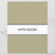 Personalizado página divisor de libros de cocina de doble cara para un encuadernador de recetas de coordinación; un diseño de un conjunto de coincidencias. Presenta un diseño minimalista moderno y sencillo en una paleta de color verde sabio moderno con texto en personalizable presentado en un banner blanco coordinado con acentos negros. El cartel muestra el texto personalizado mostrado con el texto "APPETIZERS" en letra simple. Puede cambiar el texto mediante los campos proporcionados o utilizar el botón "mensaje" para ponerse en contacto con el diseñador para obtener ayuda. Para crear su propio divisor de capítulos de la receta del libro de cocina: 1. Seleccione personalizar esta plantilla. 2. Sustitúyase el texto. 3. Revise su diseño para dimensionar y colocar. Un sencillo divisor de capítulos del libro de recetas para completar el kit de carpetas de recetas del libro de cocina, para organizar sus recetas o planes de comidas, o un reflexivo y moderno regalo de cocina para el cocinero, chef u organizador del hogar en su vida.