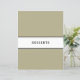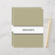 Personalizado página divisor de libros de cocina de doble cara para un encuadernador de recetas de coordinación; un diseño de un conjunto de coincidencias. Presenta un diseño minimalista moderno y sencillo en una paleta de color verde sabio moderno con texto en personalizable presentado en un banner blanco coordinado con acentos negros. El cartel muestra el texto personalizado mostrado con el texto "DESSERTS" en letra simple. Puede cambiar el texto mediante los campos proporcionados o utilizar el botón "mensaje" para ponerse en contacto con el diseñador para obtener ayuda. Para crear su propio divisor de temas de recetas de libros de cocina: 1. Seleccione personalizar esta plantilla. 2. Sustitúyase el texto. 3. Revise su diseño para dimensionar y colocar. Un sencillo divisor índice de libros de recetas para completar el kit de carpetas de recetas para libros de cocina, para organizar sus recetas o planes de comidas, o un reflexivo regalo de cocina moderna para el cocinero, chef u organizador de casa en su vida.