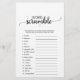 Este juego de caligrafía negra de corazón azul "mamá o papá" es perfecto para una ducha de bebé rústica o moderna. En la parte delantera de la tarjeta de juego aparece "mamá o papá?", y en la parte trasera de la tarjeta se muestra "bola de palabras". El diseño minimalista de un niño pequeño presenta una tipografía moderna y un sutil corazón azul pastel. Personalice la parte delantera de la tarjeta con el nombre de la futura madre y la fecha de la ducha de bebé. Puede personalizar las preguntas del juego haciendo clic en el botón "personalizar". LLAVE DE RESPUESTA DE CACHÉ DE CACHORA: 1.Diaper 2.Bassinet 3.Botella 4.Cárter 5.Pacificador 6.Cambio de tabla 7.Animal relleno 8.Stroller 9.Pato de goma 10.Masa 11.Tether 12.Fórmula 13.Alta Silla 14.Móvil 15.Termómetro