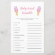 Cuta temática de helados chica ducha bebé bebé palabra scramble carta con ilustracion acuarela de helado rosa y morado en un cono de gofre. La lista de palabras de esta tarjeta están todas relacionadas con bebés y están revueltos. ¡Los clientes competirán para que puedan desentrañar todos ellos primero! LLAVE DE RESPUESTA: 1. asiento de coche 2. leche 3. bolígrafo de reproducción 4. pacificador 5. pañal 6. mecedora 7. vivero 8. monitor de bebé 9. taladro 10. fórmula 11. ducado de goma 12. acolchador.