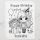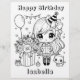 Pequeña chica de cumpleaños con sus globos, gatitos y regalos. Página de color blanco y negro simple y fácil para los niños en una fiesta de cumpleaños o sólo por diversión.