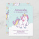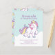Diseño asombroso de un colorido unicornio mágico cute sobre una nube de color pastel sobre fondo azul claro. Diseño lindo y divertido para el especial para la INVITACIÓN del cumpleaños de la niña. Haga clic en el botón Personalizar para reemplazar la información de la tarjeta con su información.