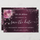 Una moderna tarjeta Save the Date para una fiesta de cumpleaños número 50 (o cualquier edad). Un color de fondo burdeos de aspecto metálico. Decorada con flores rosas, rosas y polvo falso purpurina. El texto: Save the Date se escribe con un gran guión de estilo escrito a mano.