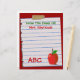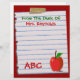 Personalice este lindo membrete personalizado, "Desde la mesa de", con cualquier nombre en este divertido, desgarrado, papel de cuaderno con una cinta adhesiva con fondo rojo con ABC en letras rojas y un ilustracion de manzanas rojas en la parte inferior. O, simplemente, deja de lado el texto por completo. Cambiar fácilmente el color de fondo y el estilo y color del texto. Simplemente haga clic en "Personalizar" para cambiar el color. Hace un gran regalo de personalizado para los profesores. ¡Personalice algunos para su profesor hoy! ¡Genial volver a la escuela!