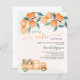 Un fondo de color verde y naranja. Decorada con naranjas y camiones de color acuático. Personalice y agregue un nombre y detalles del fiesta. Texto: Una pequeña Cutie está en camino. 1 hoja = 1 borde impreso de invitación al borde.