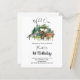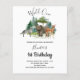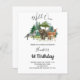 Wild One, fiesta de cumpleaños temática de los bosques. Un fondo blanco con bosque acuático y animales del bosque, lobo, oso y ciervo. Personalice y agregue un nombre y detalles del fiesta.