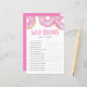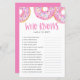 ¿Quién conoce mejor a la futura madre? | Añada esta divertida tarjeta de juego para la ducha de bebé a su evento. Esta tarjeta de juego trivia con ducha para bebés cuenta con donuts de color rosa con salpicaduras de colores. Personalice agregando nombres, eventos y fecha. Este juego de duchas para bebés de color rosa no es perfecto para cualquier temporada de duchas de bebé o tema.