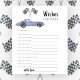 Race car Tema tarjeta de invitación a la ducha bebé con acuarela de ilustraciones de un auto vintage morado (violeta) y bandera de raza negra - blanca. "Corre para una ducha de bebé".