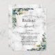 Impresión de mármol como fondo decorado con vegetación eucaliptus y follaje dorado. Personalice y agregue un nombre y detalles del fiesta. Cartas negras.