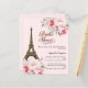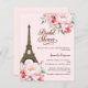 Una invitación moderna, de diseño y glamurosa para una ducha de novia, de temática parisina. La torre Eiffel de París, de fondo rosa pálido, con flores y rosas rosadas. El nombre está escrito con una escritura de estilo con letras a mano moderna. Personalice y agregue un nombre y detalles del fiesta. 1 hoja = 1 borde de impresión a borde de invitación.