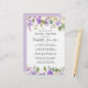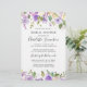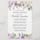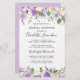 Combinación muy bonito de rosas morados oscuros, rosas morados claros y flores blancas de marfil. Todas están envueltas en una variedad de hojas verdes. Juntos crean bordes florales en la parte superior e inferior de esta invitación a la ducha de novias. El nombre de la novia está escrito en un gran guión.