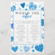 Haz que la ducha de la 'futura mamá' sea inolvidable con este divertido y dulce juego de baby shower "¿ella preferiría". Diseño con ilustraciones de acuarela de corazones azules con diferentes patrones.
