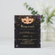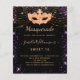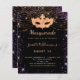Para una elegante fiesta de cumpleaños temática Sweet 16, 16th Masquerade. Un elegante fondo negro. Decorada con polvo de purpurina de oro falso morado y una máscara dorada de máscaras. Personalice y agregue un nombre, edad y detalles del fiesta. El nombre se escribe con un guión de estilo con letras a mano
